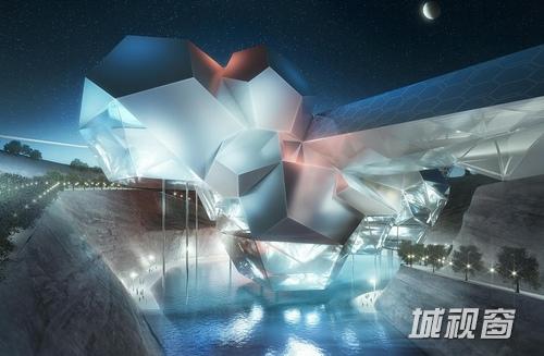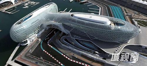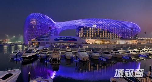阿布达比YAS酒店 网格式外壳把两个主楼合为一体,而由它产生的光学效果和光谱反射所组成景象可以媲美周围的天空、大海和沙漠风景。