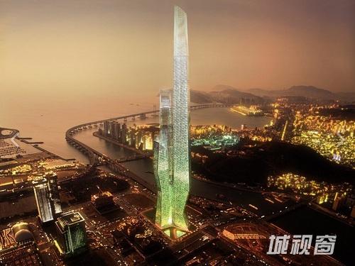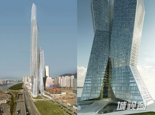 釜山国际贸易中心 650米的建筑方案,这将成为亚洲最高的建筑。渐近线提出三个独立的、锥形向上延伸的塔,在结构上从50楼开始相互捆绑。这个戏剧性的位置,使三个细长的塔变得更高,优雅地向上逐层减少,中央孔隙形成空中花园。