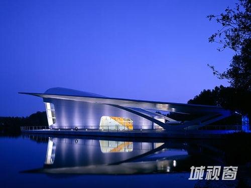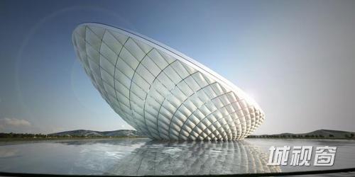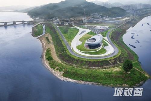 大邱河流文化多媒体展馆 圆弧的设计不仅是出于外形美感的考虑,也是为了强化建筑与周围景物的融合。这个建筑就像半只鸡蛋坐落在一片草地上,外表由无数方形构成,银色的建筑体显得特别干净清爽。