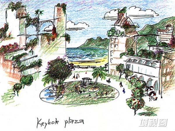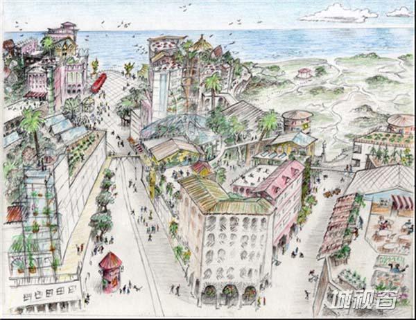 理查德这幅手绘图可以体现其生态城市的理念。全新的城市中心设计方案可帮助美国新奥尔良免遭洪水的侵袭。当风暴来临时,建筑物顶端的附属设施可帮助屋内和庭院阻挡洪水,自然生长的植被不再被移除,而是允许在城市内生长,以此来抵消海浪和洪水。这样,城市中绝大部分建筑物都不会被洪水破坏。