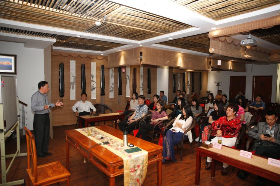 古香古色的茶室中,木质座椅,茶香四溢,到场来宾们一边品茶,一边听课。出席此次活动的嘉宾有中国建筑文化研究会、建筑装饰文化专业委员会马彦霞 秘书长,中国专业人才库全国易学考评管理中心、全国易学专业人才考评专家委员会韩毅主任,两位嘉宾在活动开始进行了简短的致辞。接着便由此次活动的主角 ——著名学者知名堪舆文化大家、中国经贸促进会副理事长、环球专家智库网特聘专家智库易洪波教授亲传古典堪舆学术,解密风水文化玄机。