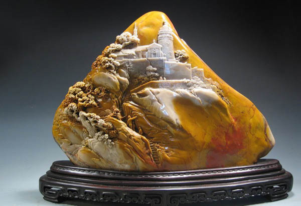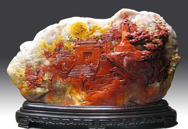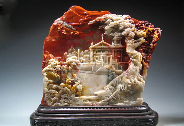 《妈祖阁》利用寿山石红、黄、白三种天然色彩,以精湛的半圆雕、高浮雕、薄意雕等技艺,刻划出秀丽的妈阁风光。艺术表现上,宏略大度,丰富多变,讲求整体神韵和意境美。作品主题突出,以艺术浓缩手法,把路环的妈祖雕像融入妈阁组群,强化了主题内涵;刻划精细凝炼,写实手法的深化,在这里得到充分展示:妈阁庙、牌坊、石亭……错落有致,生动形象,近景远景融为一体,起翘的庙脊、庙前的石狮,都体现出妈阁这一历史遗迹的特征;而动静、疏密、远近、今古建筑的刻划对比,更使古老与现代之间相映成辉,妈阁,宛若琼宫玉宇。