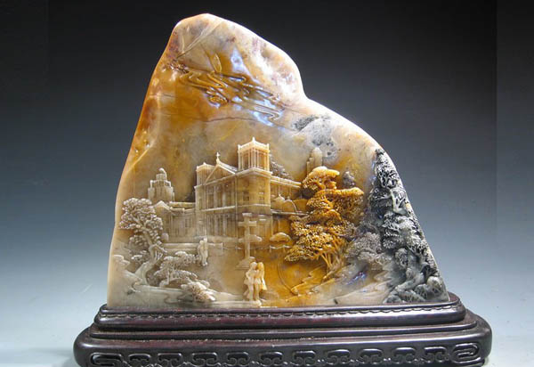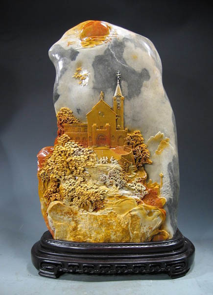 《主教山教堂》作品追求整体效果。为了更好地表现主教山教堂均衡美感的特征,作者大胆地剔除石料中不和谐的部分黄色,以黑色衬底,使主题突出;运用散点透视,以浮雕技法进行深入细微的刻划,把具体形象组进了与现实相适应的结构之中,突出了教堂的尖拱顶结构和高高的钟塔,以钟塔上的矩形十字表明宗教性质,借飘浮的云彩衬托钟塔之高,并使之与教堂直刺天空的屋顶、精美的教堂三面结合起来,形成同一体,从不同角度让人感受到和谐的形式美。作品结构合理完整,部分创作手法与造型趋于凝重典雅。