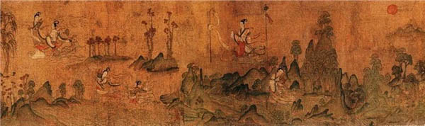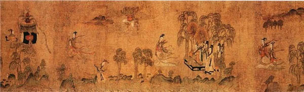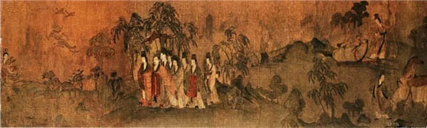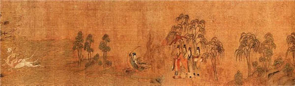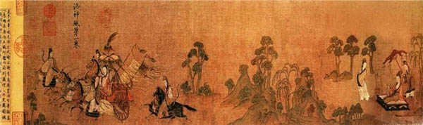 这幅画根据曹植著名的《洛神赋》而作,为顾恺之传世精品。这卷宋摹本在一定程度上保留了顾恺之艺术的若干特点,千载之下,亦可遥窥其笔墨神情。全卷分为三个部分,曲折细致而又层次分明地描绘着曹植与洛神真挚纯洁的爱情故事。人物安排疏密得宜,在不同的时空中自然地交替、重叠、交换,而在山川景物描绘上,无不展现一种空间美。