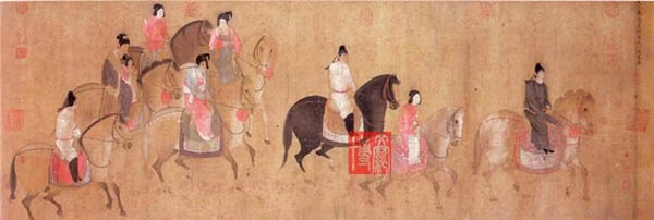 《唐宫仕女图》,唐代作为封建社会最为辉煌的时代,也是仕女画的繁荣兴盛阶段。中国古代仕女众生像,“倾国倾城貌,多愁多病身”,唐代仕女画以其端庄华丽,雍容典雅著称,《唐宫仕女图》展示着“回眸一笑百媚生”的唐代美女众生像。 其中最杰出的代表莫过于张萱的《虢国夫人游春图》、《捣练图》和周?的《簪花仕女图》、《挥扇仕女图》以及晚唐的《宫乐图》。它们所表现的贵族妇女生活情调,成为唐代仕女画的主要艺术特征。