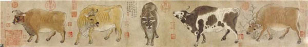 这幅《五牛图》,是韩最为传神的一幅。5头健硕的老黄牛,在这位当朝宰相笔下被“人格化”了,传达出注重实际、任劳任怨的精神信息。它问世后,收藏者包括赵构、赵伯昂、赵孟兆页、乾隆等著名人物。在明代,它几易其主。清兵入关后一度下落不明,直到乾隆年间,才从民间收集到宫中珍藏。1900年,八国联军洗劫紫禁城,《五牛图》被劫出国外,从此杳无音讯。上个世纪50年代,它被一位寓居香港的爱国人士发现。