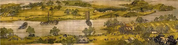 《千里江山图》,北京故宫博物院馆藏珍品。绢本,设色,纵51.5厘米,横1191.5厘米, 为中国北宋青绿山水画作品。作者王希孟。王希孟18岁为北宋画院学生,後召入禁中文书库,曾得到宋徽宗赵佶的亲自传授,半年後即创作了《千里江山图》。惜年寿不永,20馀岁即去世,是一位天才而又不幸早亡的优秀青年画家。