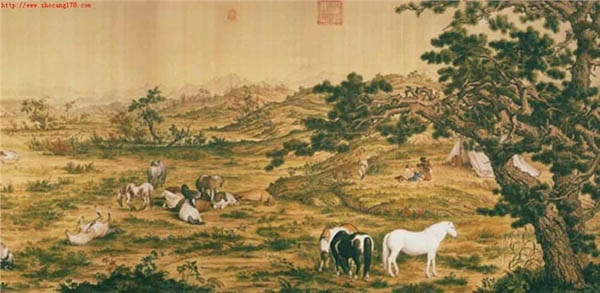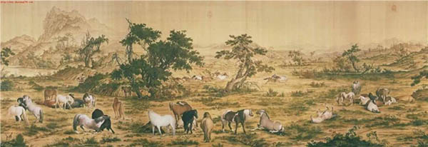 《百骏图》,该稿本为纸质,纵102厘米、横813厘米。目前保留在美国纽约大都会博物馆。意大利人郎世宁1715年他以传教士的身份远涉重洋来到中国,就被重视西洋技艺的康熙皇帝召入宫中,从此开始了长达五十多年的宫廷画家生涯。在绘画创作中,郎世宁融中西技法于一体,形成精细逼真的效果,创造出了新的画风,因而深受康熙、雍正、乾隆器重。《百骏图》是他的代表作之一。