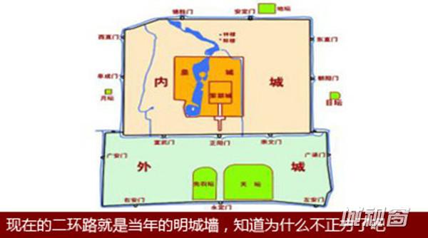 北京城为什么不是四四方方的呢(参考现在的二环路)?明朝时为了防御蒙古骑兵,嘉靖皇帝本想给北京修一圈外城,让北京变成“回”字形。修外城的工作量太大,于是先修了南边的一段儿。修完这段外城,朝廷发现没钱修不起外城的剩余部分了,于是在修好的那一段外城的东西墙的北端,又各修了一段东西向的城墙跟内城连上。于是北京城就变成“凸”字形的了。