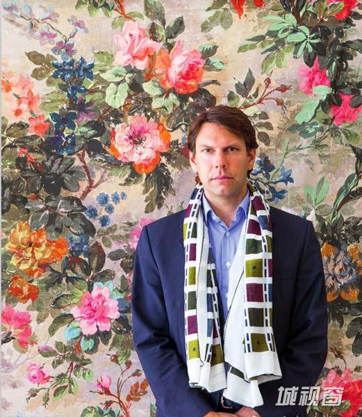 年轻的Theodore去年刚在Breteuil古堡举行了自己的婚礼。围巾来自Hermès,背景花朵面料来自Rubelli。