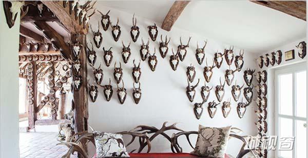 Stephane朋友家的猎人小屋。它是典型的法国打猎小屋的样式,由砖石结构建成,具有质朴的乡村风格。“打猎后,我们会把动物的角、头或牙齿留下来挂在墙上,这是很法式的一种观点,认为这是对动物的尊敬。因为你没让它们活下去,而死之后你能看到它们的样子,更了解它们。”靠枕和毯子均来自Hermès。猎人小屋内挂着历次打猎的收获,这是法国人表达对猎物尊敬的一种方式,羚羊与鹿角制成的休息椅十分独特而切题。
