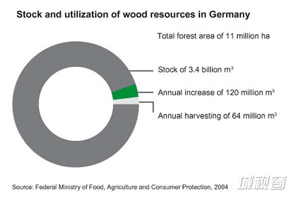 图05:德国木材资源比例,灰色代表蓄积量,绿色为年生长量,白色为年砍伐量。