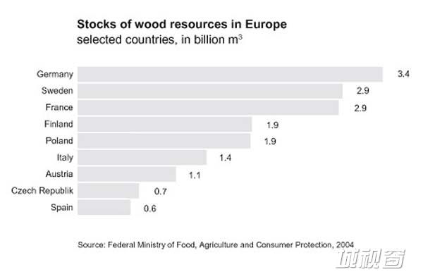 图06:欧洲国家木材蓄积量比较,德国第一,其次是瑞典、法国和芬兰。