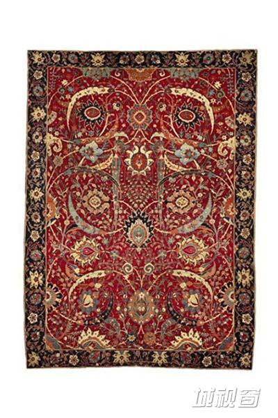 这条地毯由羊毛、棉花和丝绸共同织造。它曾被威廉•克拉克捐赠给华盛顿的柯可兰画廊。
