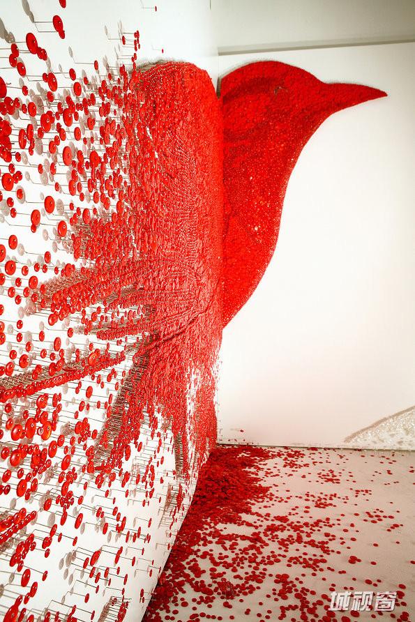 Ran Hwang说,“这种巨大的墙上装置,是非常耗时的重复体力劳动。这是一个冥想的做法,帮助我找到我的内心安宁的形式。引脚的作用是使按钮的表面形成一个轮廓,或瓦解的形象。不使用粘合剂,这样可以使按钮完整的保留下来,并且便于移动,这意味着人类犹豫不决的遗传倾向。我使用的按钮,因为他们在我们的生活中非常常见和普通。”