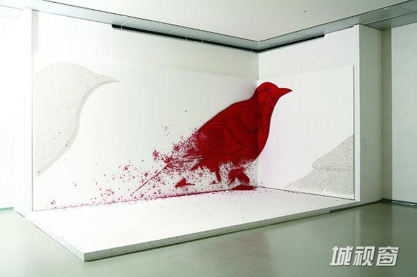 来自韩国艺术家Ran Hwang用纽扣、大头针创作的大型装置。当您近距离观看作品时,他们似乎是一堆纽扣和大头针,但在一定距离之外观看这个装置则变成鸟和樱花树等惊人的图像了。