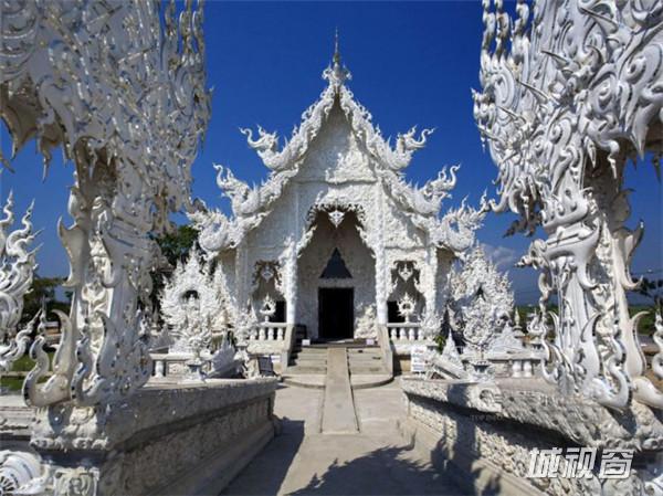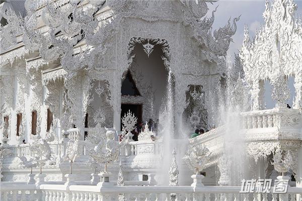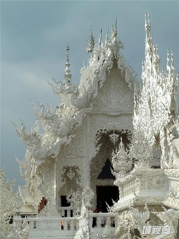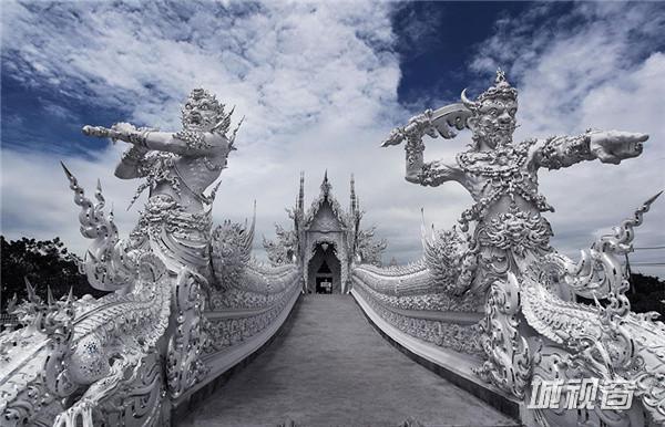 清莱白庙纯白的屋顶,纯白的墙壁,纯白的基座,镶嵌在墙面的玻璃时不时反射出耀眼的银光,仿佛一座落入凡间的琼楼玉宇,让人瞬间产生敬仰之情。庙堂前一池浅浅的碧水,几条小鱼惬意的摇摆,访问白庙需要跨过一座廊桥。设计师的用意是为表达佛教普渡众生慈悲为怀的精神,也为白庙的庄严增加了一丝柔美。