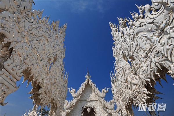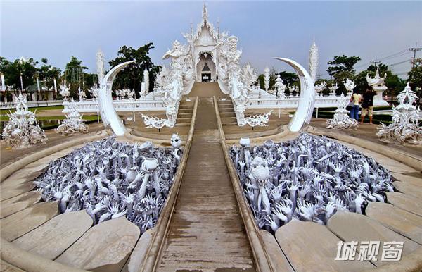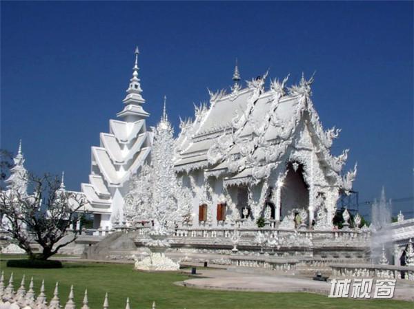 这座庙建于1997年,由泰国著名建筑师(原为画家)Chalermchai Kositpipat设计建造,建庙资金来自他二十年来的积蓄,以及有心人的捐献,他在建造中间曾经几次修改图纸,工程做的特别慢。但也正因为他对佛祖的 忠诚 ,还有对建筑设计的执着,造就了这么一个精细,完美的寺庙。这座寺庙为什么要为白色,他说:白色代表了纯洁,闪闪发光的玻璃片是智慧的象征。