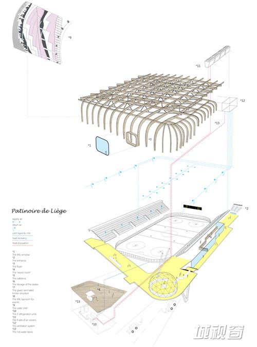 优秀的工程设计同样是让这头“海中怪兽”达到高水准的保证,并且能够有效地重复利用能源——热泵、通风系统和热水箱是利用制冷单元产生的热量的一部分,而管道系统又能将冷却的液体输送到溜冰场各部分以达到更好的制冷效果同时消耗更少的能源。而根据初步研究,与旁边购物中心的供热系统相连是另一种利用多余热量的办法,也许在不久的将来,两幢建筑之间的热能交换能够实现。