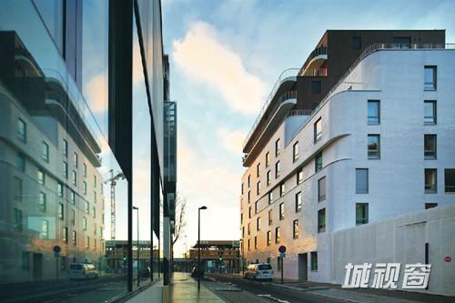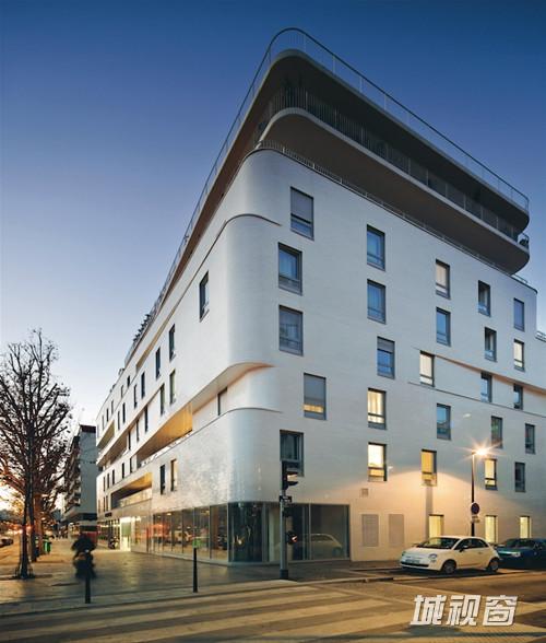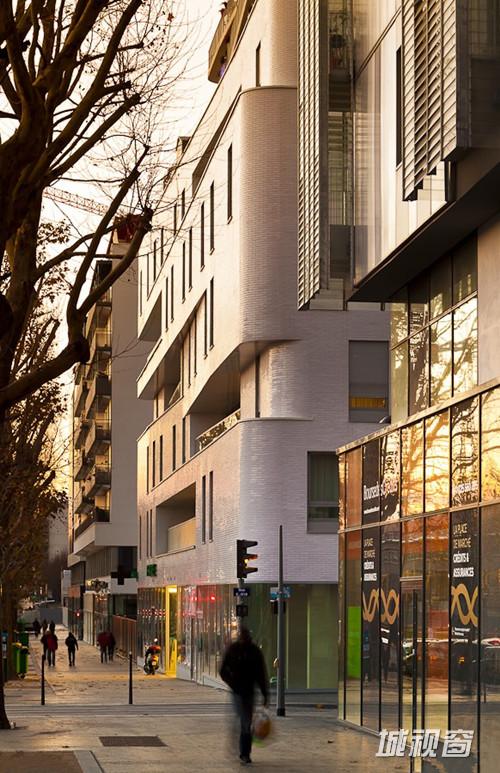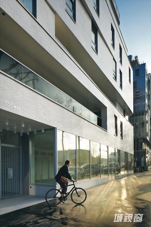 由于顶部四层为低密度户型,托盘得以连续地退进,从而给公寓提供阳光充裕宽敞的露台。外墙和楼板的位移,配合着连续的回缩,暗示着内部功能的变化。