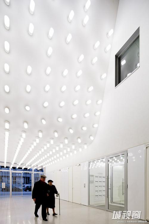 在处理这个居住用途(面对各年龄阶层)的建筑时,设计者应用了托盘堆叠的逻辑。商业空间和退休之家的入口位于底层,接着就是五层楼的退休之家,而最顶部的四层含括了私人公寓。地下室包含给住户提供的停车位和退休之家的厨房、维护室和储藏室等辅助空间。