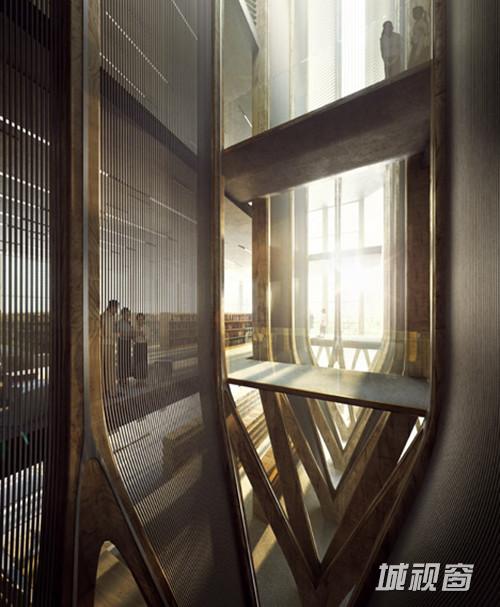 该建筑的锥形构造可以为较低楼层提供遮蔽,而百叶窗又可以为上层提供遮阳。这些遮蔽为适应各个塔楼的采光需要而巧妙地改变角度。