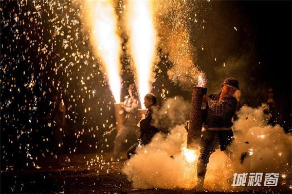 日本传统的焰火表演——手持圆筒式焰火。在日本爱知县丰桥市举行的吉田神社祗园祭节上。摄影:荣信铃木