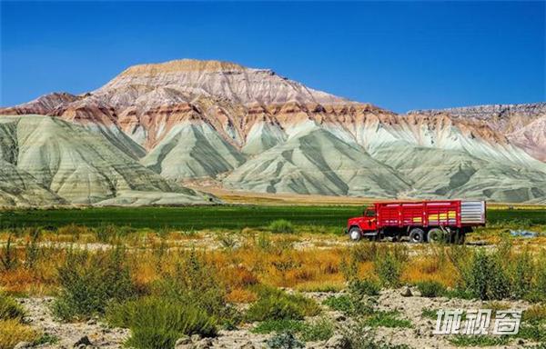色彩鲜明的火山前,开过一辆红色的卡车,可谓画龙点睛,摄影:Mehmet Gokyigit