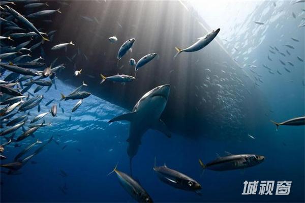 在墨西哥瓜达卢佩岛的海上,大白鲨聚集一起吞噬海狮,摄影:Marc Henauer