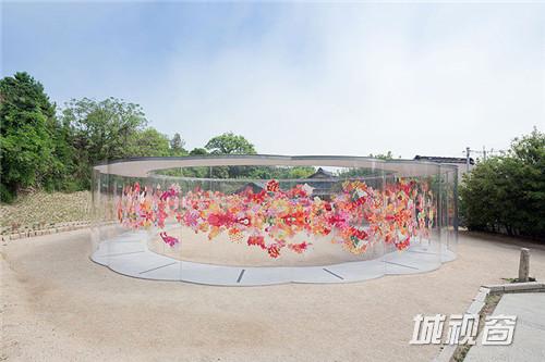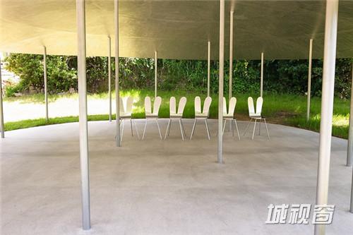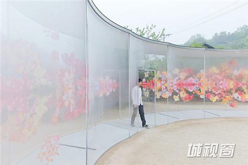最新完成的是花朵一般的A-Art House——一座透明的、由充满活力的红色、粉红色、黄色花瓣图形装饰的展馆。游人进入入口后,可以沿着环形的透明展馆行走,也可以进入环形中央的休息区,在两个银色的凳子上休息或沉思。这个优雅空灵的空间融合了艺术与建筑,它半透明的材质与简单清晰的结构令站在里面的游人得以欣赏室外的全景。
