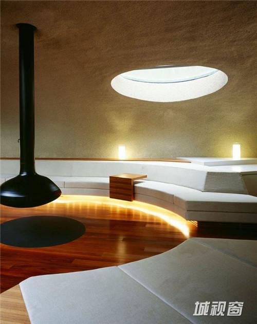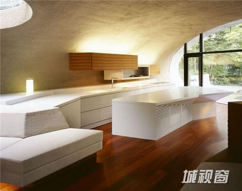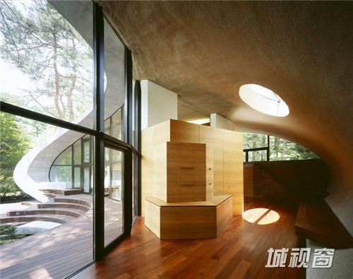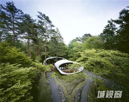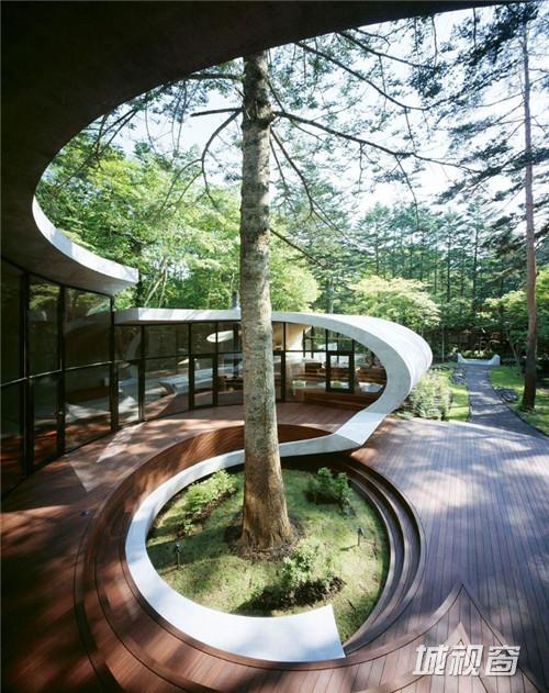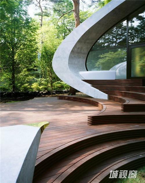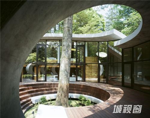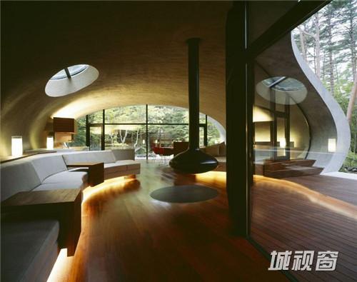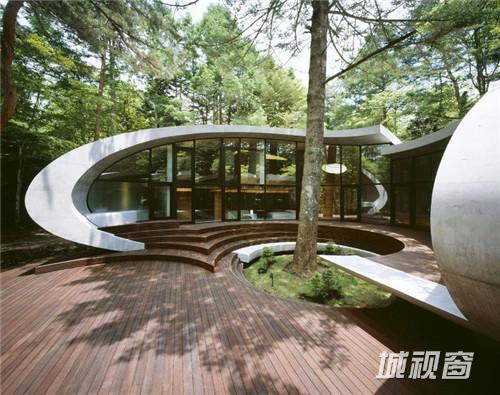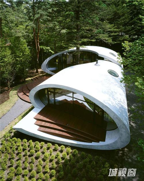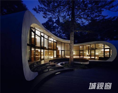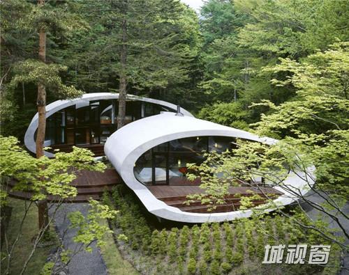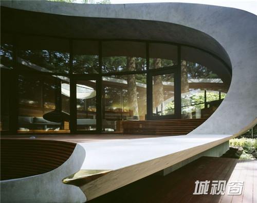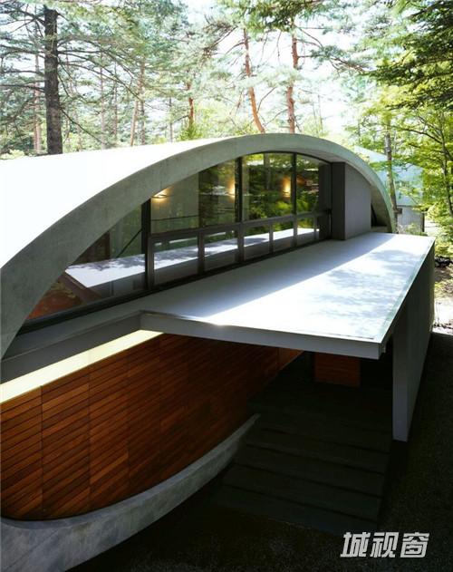 由建筑师 kotaro ide设计的“贝壳馆”(Shell House),是一个建在轻井泽森林中的类似“壳”结构的建筑。项目坐落于日本长野县。项目定位为一座度假别墅,同时要求具有抵挡当地夏季潮湿,冬季寒冷的功能。为实现这一目标,ide没有选择当地易腐而脆弱的传统木结构,取而代之的是利用增强型混凝土去建造了两个椭圆形截面的壳形结构。“贝壳馆”(Shell House)的外形轮廓呈现了J的形状,内侧外墙升起地面1.4米,产生好像漂浮半空的平台。利用Ulin木材围绕着建筑创建了阶梯状台阶,围绕出一个家庭活动的中心庭院。别墅简洁的审美取向使它很好的融合到传统的日本景观中,在未来主义风格的建筑与其所处的自然环境之间达到了完美平衡。整个“贝壳馆”(Shell House)工程耗时18个月。