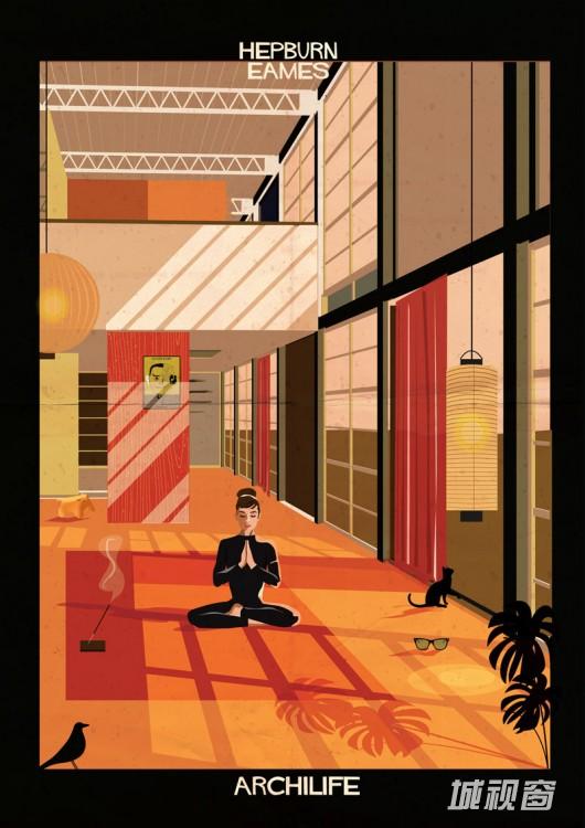 这些插画展示了历史上最著名的电影明星们在非常温馨的室内的日常生活,用建筑和艺术界的缪斯们装点“平凡的日常”。“我们一直使用形而上学的方式感知和认识建筑空间。同样的,我们看到的往往是演员的角色,而非演员本人。”他说,“我想尝试扭转这种模式,将建筑变成‘家’,将演员变成‘人’。”