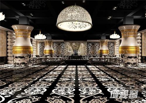 挑高的空间,将空间气势淋漓尽致的体现出来。时尚的造型和绚丽的灯光,结合点缀巧妙的精致罗马柱,使空间在时尚的同时又含有一种厚重的文化气质。简化后的空间,省去繁杂的修饰,反而体现了空间的大气。精美的花纹炫酷的色彩却在大气中透出华贵,浪漫。