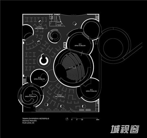 凯旋阁入口与公共空间自然光切入球体的开叉部分进入球体内部。建筑内部将被骨灰盒占据绝大部分的空间。骨灰盒的排列方式将或直线,或正交,或成一个圆。建筑主题为白色混凝土,地板将采用黑色花岗岩,桧木用于门与隔断。礼仪堂采用半透明的石膏和金箔。21个客床位的旅馆位于建筑一侧外凸的方体中。这个50万平方英尺的综合体将于2015年5月动工建设。