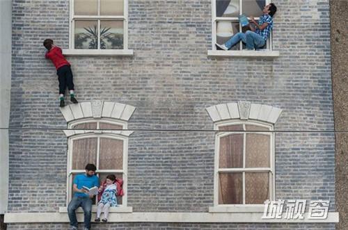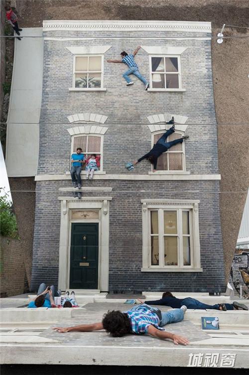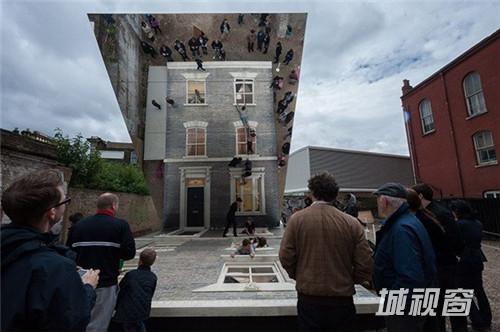 这座维多利亚时期的住宅曾经位于伦敦一条寻常的大街上。Dalston House(达尔斯顿住宅)曾经有着经典的立面造型,完美的比例与精致的细节。不过不要以为它还在那里供人居住,这只不过是个错觉而已……来自阿根廷的艺术家林德罗·厄利什(Leandro Erlich)将Dalston House(达尔斯顿住宅)的立面造型以1:1的比例在地面上还原,然后通过一面巨大的倾斜45度的镜子将立面还原到镜子中,于是就有了下面看到的魔幻情景,人们可以轻松帅气地在房子上攀爬,匍匐行走,你甚至可以躺在墙上睡上一觉。Leandro Erlich希望以此方式纪念那些在战争中“牺牲”掉的建筑,同时为人们创造了一个非常有趣的装置作品。视频中那个穿蜘蛛侠衣服的小孩真是萌翻了!