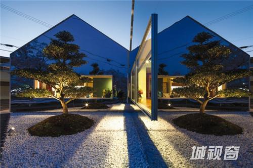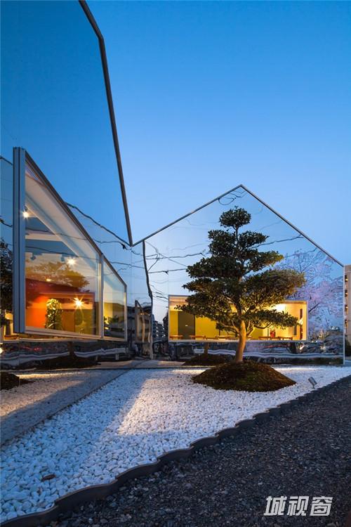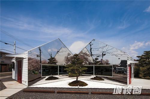 这是一座位于日本岐阜县的咖啡厅,路过这里不留神的话还以为这块的空间发生了扭曲,莫非出现了虫洞?细看才发现原来是建筑的两个山墙面采用了完整的镜面材料,只有靠近下面的一段开窗仿佛浮在半空,给人穿越的感觉。
