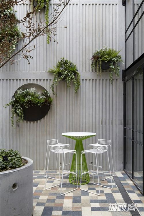 外部的设计固然抢眼,不过水泥管毕竟是冰冷之物,为了让整体格调平衡,设计师特别在建筑内增设了一个直通顶楼的中央庭院,一来有助採光,二来庭院内的植物还有绿色的户外傢具能够带来生机。再加上皮革家具、暖色灯光还有木材的运用,让整个室内环境都既有现代气息,又不失自然朴素和温馨。