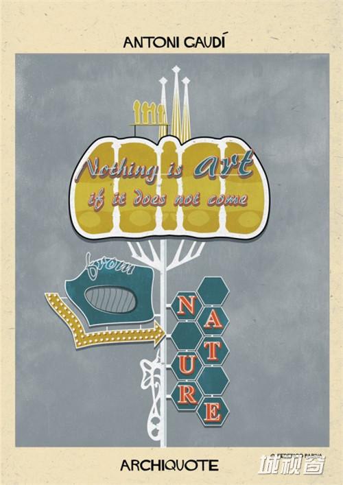 Federico Babina又干了一次!这次他创造了13块拉斯维加斯风格的广告牌来宣传这个行业最多产贡献者的建筑概念。Federico Babina是如此描述ARCHIQUOTE背后的想法的,就是把从Mies van der Rohe到Jean Nouvel到Rem Koolhaas这些建筑大师们的建筑概念和美学方面的文字形象化。“这些文字可以被看作是建筑,”Federico Babina说,“简单的概念具有深厚的意义,而复杂的想法用简单的方式表达...广告牌让人联想到一个建筑的拉斯维加斯,其中的短语引导我们更多一点了解通过体积和空间构成的作品后面隐藏的想法......在这13块广告牌中,格言和图形以一种游戏的方式混合、穿插、融合在这些插画中。