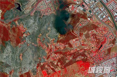 2014年5月25日卫星在美国加州圣迭戈县上空拍摄的照片,用于监控野火火势,评估损失。