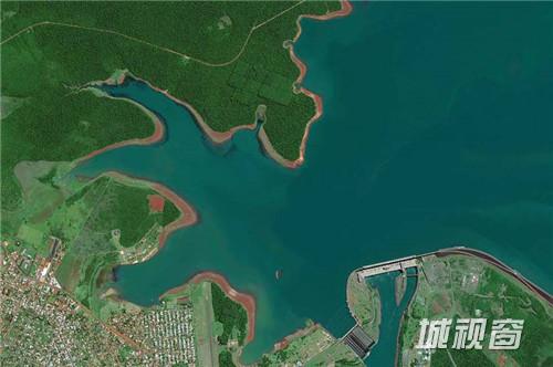图中是巴拉圭的伊泰普水电站卫星图,可用于监督建造新大坝对大面积水域的影响。
