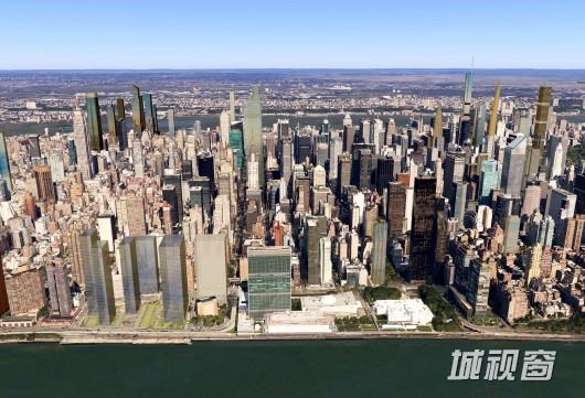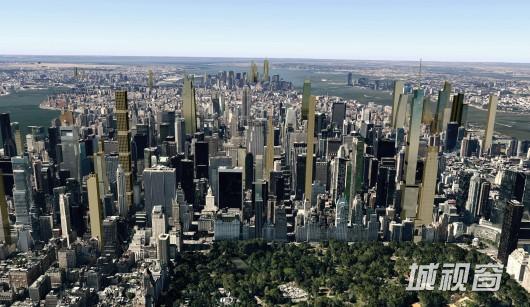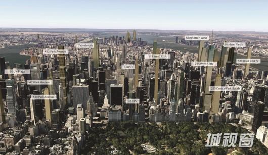 在中城区上空向北看,可以看到中央公园和沿着“亿万富翁大道”规划的超高层大楼们。