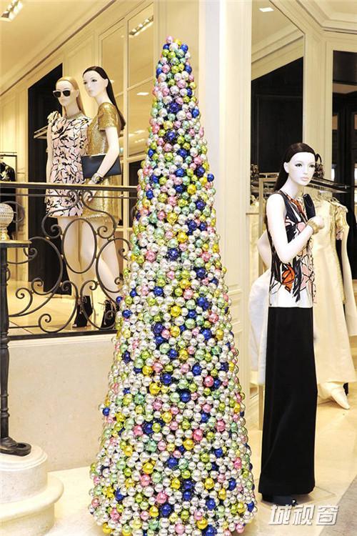 ▲ Christian Dior 的圣诞树是蓝、黄、白、红、绿五色彩球拼接的炫丽装置