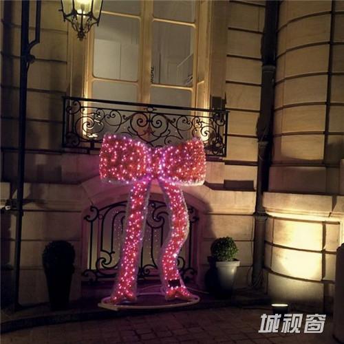 ▲ 首次参加圣诞树设计的尚塔尔·托马斯(Chantal Thomass)在巴黎顶级拍卖行艾德(Artcurial)门口树立了一只巨型粉红色波点蝴蝶结,垂下的两股化作妩媚双腿