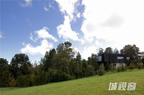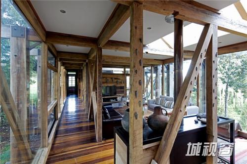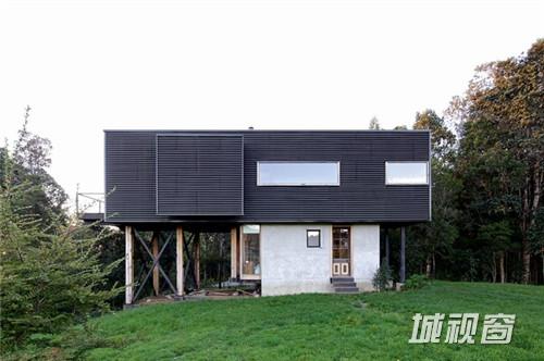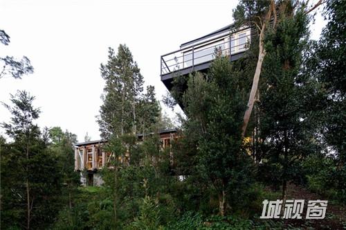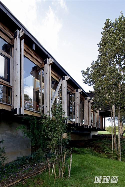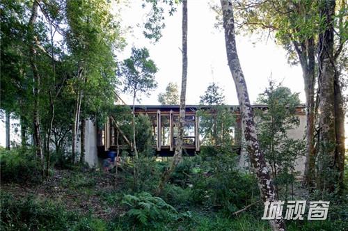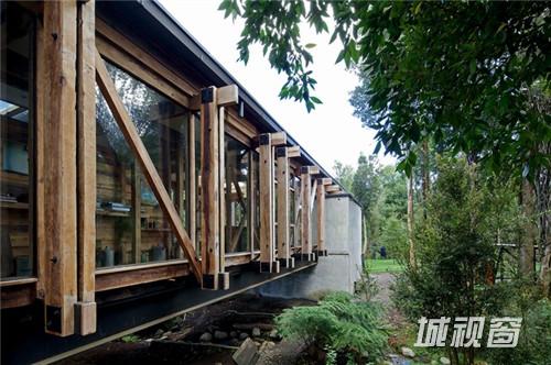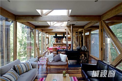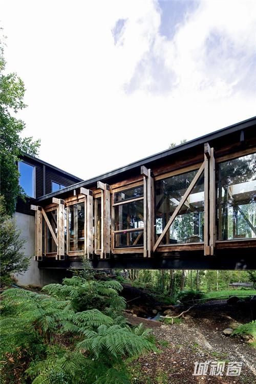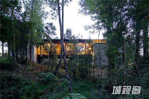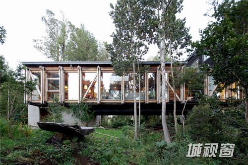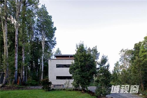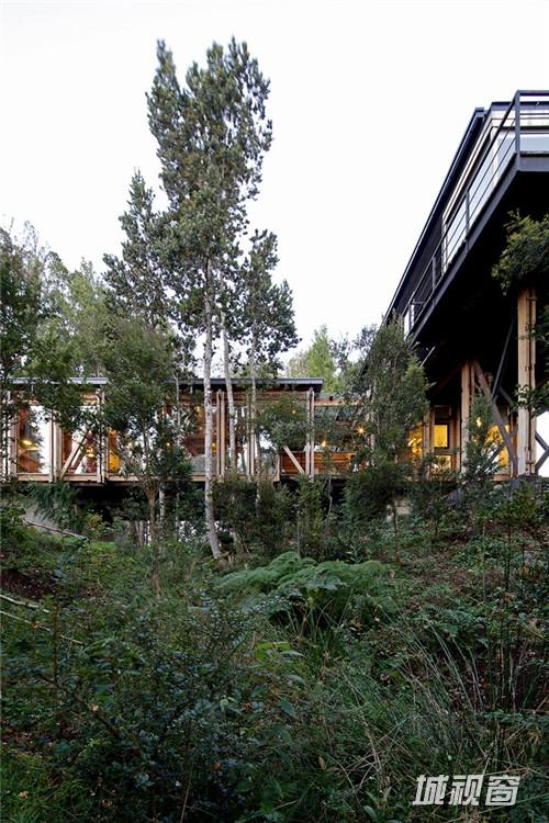这是一座位于智利湖大区(Los Lagos Region)巴拉斯港森林中的住宅。由来自智利当地的Aranguiz-Bunster Arquitectos事务所设计设计。林中树木茂密,长满了各种当地树种由于地处坡地,雨水冲刷产生了局地的鸿沟,为了避免对树木造成砍伐,同时避免鸿沟的影响,建筑选择了横跨在一处低洼地带所以取名Bridge House。建筑在“桥”的部分采用了原木材加大量玻璃的应用,这样做首先是为建筑内部创造一个理想的光照环境,同时使建筑的存在尽量对森林环境产生较小的影响。桥的两端以混凝土“块”作为支撑的桥墩,使得“桥”的部分不用柱子得以完全架空。桥内部作为家庭的起居室,有着绝美的林地风景和明媚斑驳的阳光,一边的端头作为厨房餐厅与起居室相连,另一端作为卫生间与相对需要私密的卧室。如果雨天到来,水从山坡上流淌下来,这不就成了另一座流水别墅了吗~