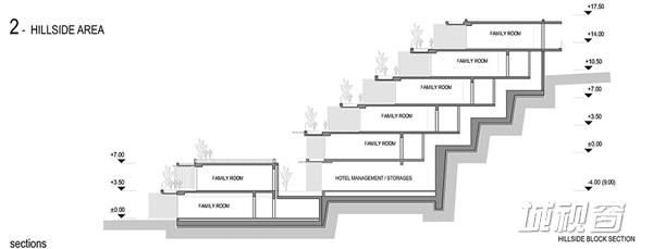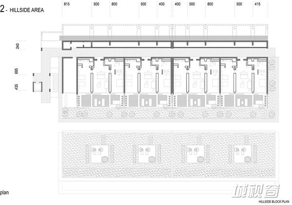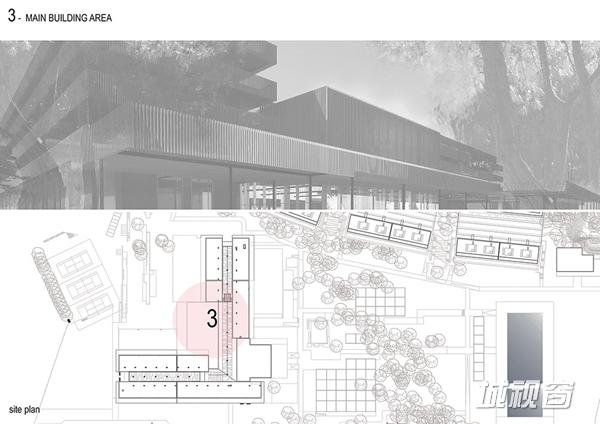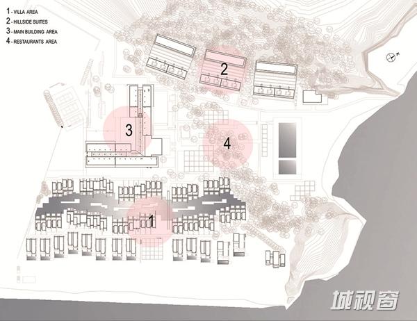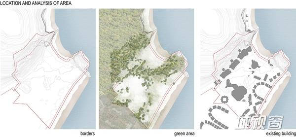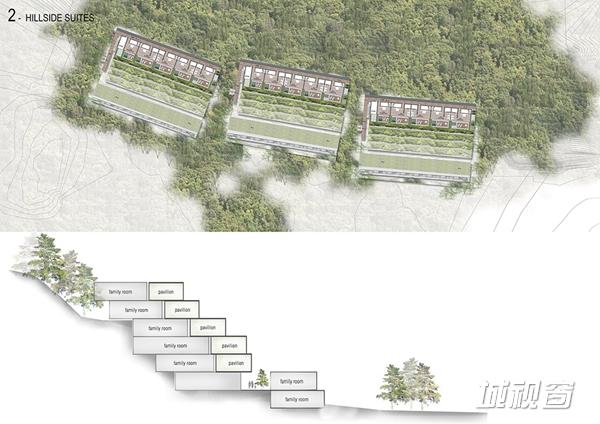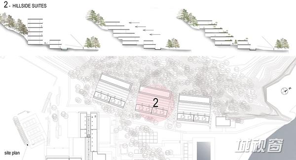 该区域的工作焦点为“修正”。也就是说,轻微的改变场地,在斜坡上作出梯田式平台安放建筑。利用当地的天然石材和木材,实现建筑与自然环境的和谐。