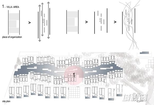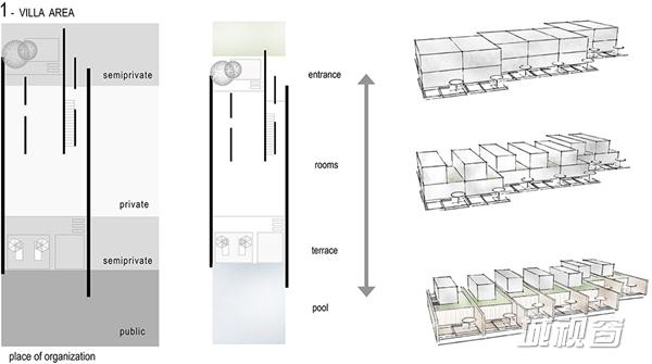 联排别墅位于相对空平坦的海滩区,每家每户的体量在前后都稍有错开,片墙成为限定空间的主要元素,定义出公开,半私人和私人空间。水域在建筑前或者后展开,与片墙发生接触,成为一个渗透进入建筑的元素,将这片区域定义出永恒宁静的氛围。