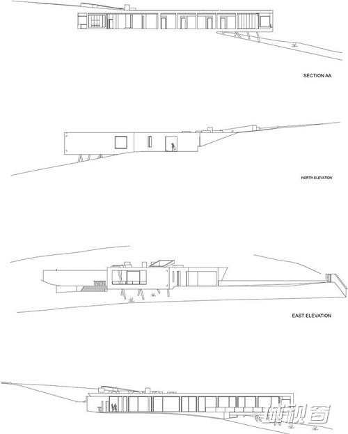 整座住宅的设计简洁、轻盈,其结构平衡而精确,且具有鲜明的现代感。住宅矩形的形体起始于场地内的缓坡,并一直向外延伸,悬挑于坡地之上。其悬挑部分由管钢柱支撑,以尽量减少对场地环境的影响。住宅的房间沿线性布置,每个房间都能看到并通向朝南的露天平台。遮挡在露天平台上方的平屋顶同时作为矩形形体的一部分,充实了整座住宅的造型。