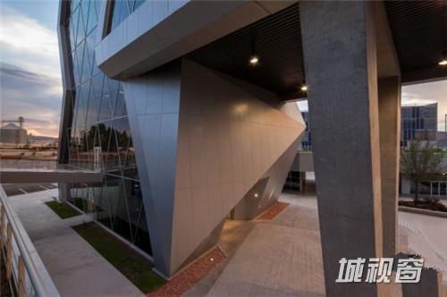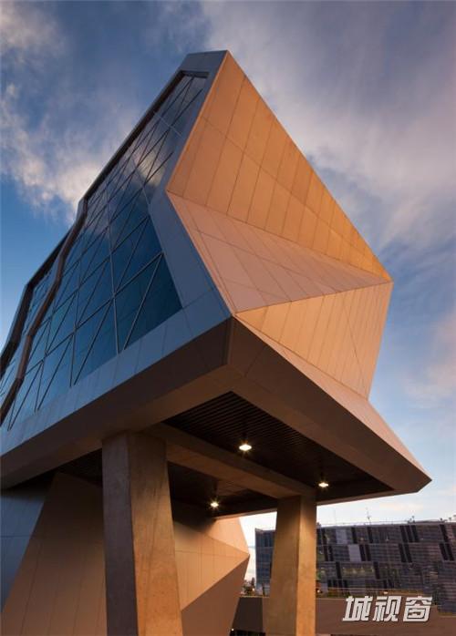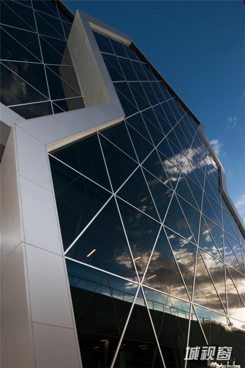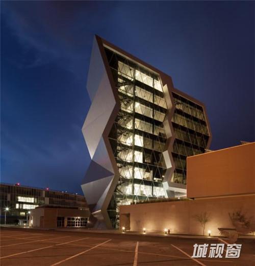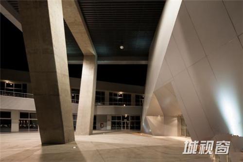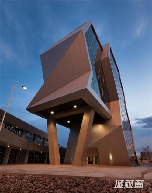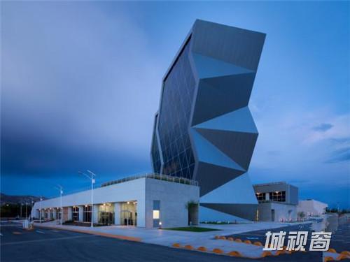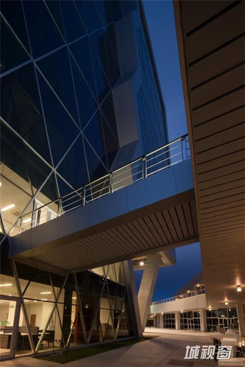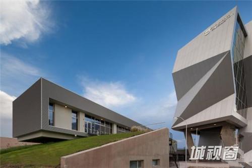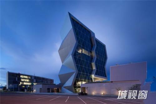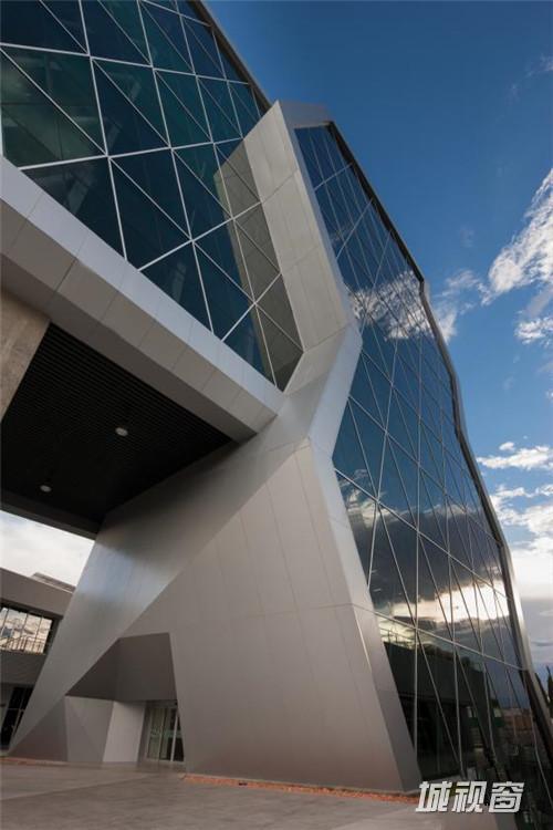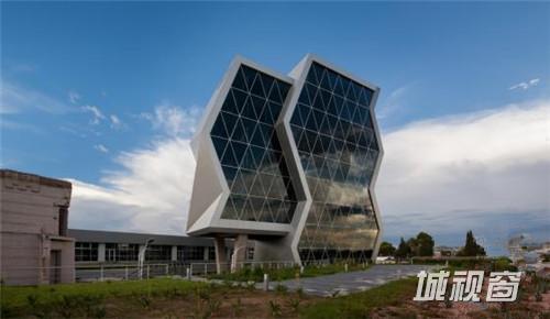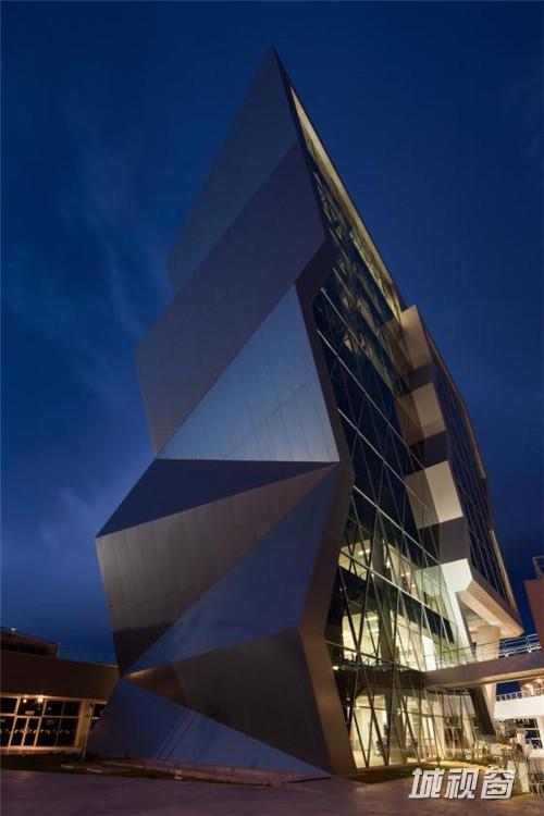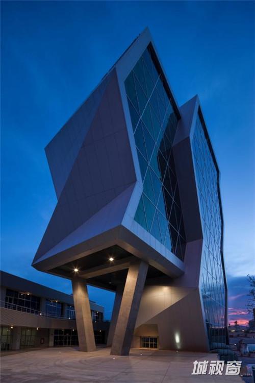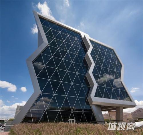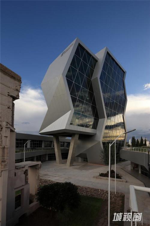 这是由Grupo ARKHOS设计的奇瓦瓦研究及创新中心。建筑需要反映前卫而创新的设计。此外,出于对可持续发展的理念,建筑师在这个项目建设中以LEED金牌认证为目标。建筑造型的几何性受到“隐形”技术的影响,这种技术常用于航空及跑车。该建筑设有墨西哥内数一数二的大型绿色屋顶,面积达2500平方米,位于实验楼屋顶。花园灌溉用水正是使用了这些建筑处理用水。办公室和实验室拥有充足的自然光线,一整天下来几乎不需要开灯,另外公共区域的照明通过光伏电池板提供电源。建筑共10层,从中心广场进入,在悬挑体块内设有三层高的中庭,创建了办公室职工、学生及实验室研究人员之间的公共交流空间。
