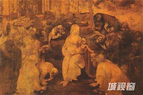 达芬奇是文艺复兴三杰之一。此件作品取材于圣经中耶稣诞生之时 东方三博士前来朝拜的故事。此幅作品虽未完成,但以激烈对比的构图和形象表现显示艺术上的创新:圣母、圣婴和三位博 士形成三角形的稳定构图,周围的群众却以激动的手势环列左右,宛如人群组成的漩涡;背景上按精确的透视法画出的建筑遗迹和奔腾飞跃的马队也形成强烈的对 照。作品一反15 世纪绘画明晰透露的特点,力求幽微含蓄,在艺术手法上形成他独创的烟雾状色调。