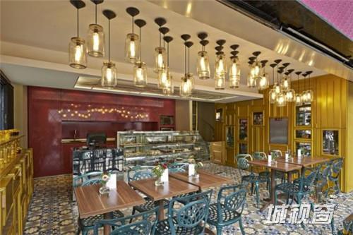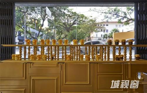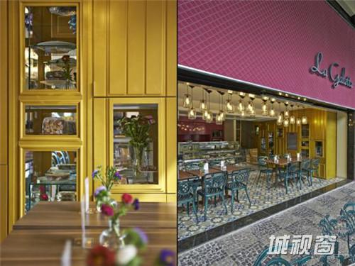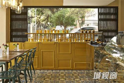 这个项目的最初目的是将这个存在了25年之久的糕点店重新包装,让它以一种全新的姿态开始运营。同时,还必须考虑3个基本的装修原则,那就是:回收、再利用和转化。桌子上方的吊灯,是用之前小卖部留下来那种保存食物的玻璃罐改造而成的,石膏嵌入做成的灯、冷藏陈列柜和餐椅也都是以前的小卖部遗留下来的。餐椅被用绿色的汽车漆重新涂刷,这让他们在新店里看起来更加醒目。金黄色的储存柜是用各种门上装饰和镜面装饰做成的,这个柜子让待出售的各种物品看起来更加光彩夺目。同时,金色也是怡人而具有诱惑力的颜色,而粉红则给这里带来一丝玩世不恭的感觉。水泥地板上使用的则是与这些颜色大不相同的对比色,包括蓝色、灰色和黑色,这种明显的色彩反差使这里看起来既古典又现代。